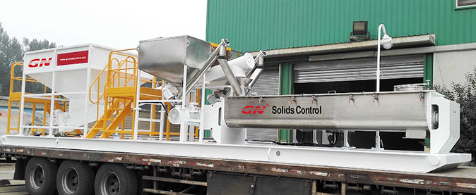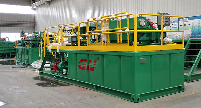 本套系統分為2個階段的固控處理和一套泥漿配置混合系統。鉆井泥漿初步分離采用的是冠能GNZS752型振動篩,200GPM的處理能力、兩片篩網的構造用來處理鉆井泥漿中的大顆粒的固體。振動篩處理后的液體通過離心泵輸送給迷你型的沉降離心機GNLW223進一步處理,可達3800RPM的轉速,分離的固體顆粒可達到2個微米。